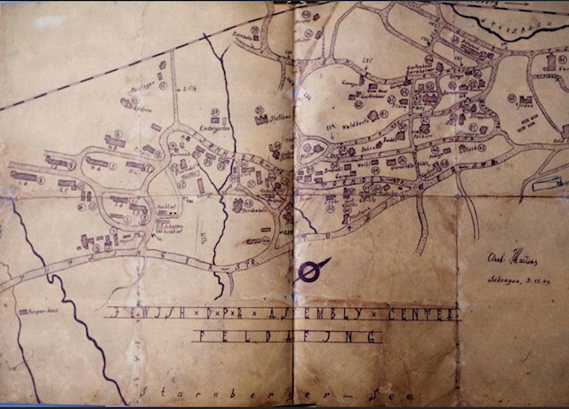 Mittergars is now a field of wheat. In the adjoining forest, where the guards had lived, we found the foundations of two SS Baracks as well as the concrete punishment cell. As I was walking around the site, an old man on a bicycle came pedaling up the dirt track. He stopped, and obviously curious about our presence, said hello. I began chatting with him and found that, although he had been based elsewhere during the war, his friend had been a guard at the camp. Not only that, but he had copies of his friend’s documents relating to the camp. He invited us to his home where we were seated in the backyard and his wife treated us with refreshing cold drinks. He brought out a folder of papers, and as I thumbed through them, I was shocked to see a familiar handwriting. There, before my eyes, was a post WWII affidavit, written and signed by my father, stating that this guard, Helmut Schwalm, had been humane in his treatment of the prisoners. How incredible that here I’d be, 57 years later, sitting in a Bavarian peasant’s backyard, and by pure chance stumble upon this document