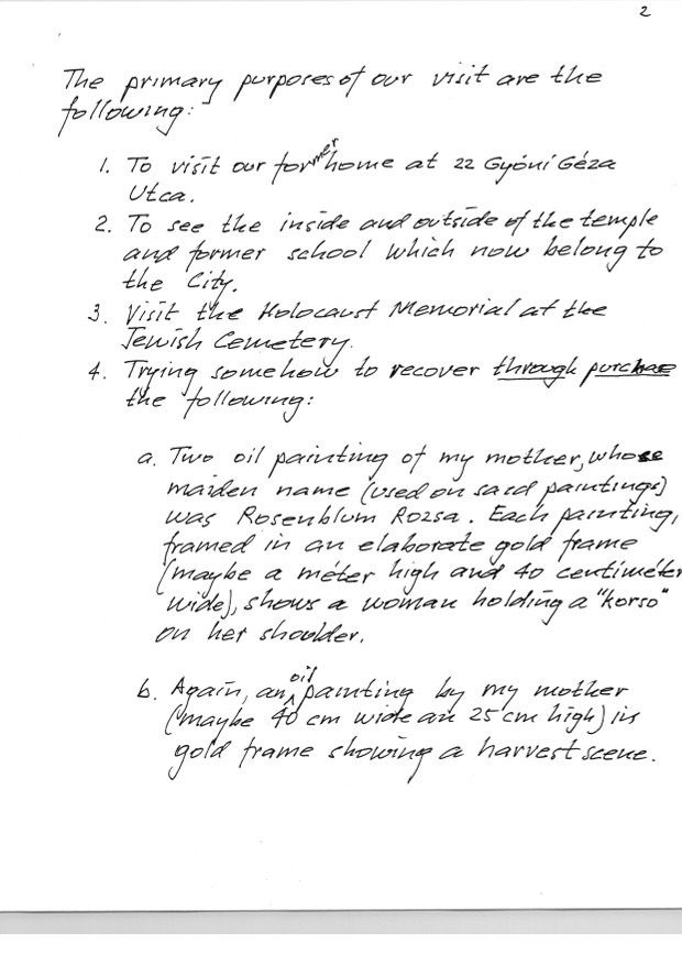 We exchanged family pictures, and then she took out two letters my father had written to her mother-in-law from Feldafing, the DP camp where we lived after liberation. The letters told the family that only he and I had survived and asked about the condition of our home. Neither letter received a reply, but now my neighbor told me how our home was robbed by well connected people after we were sent to the ghetto. It had taken a whole wagon to carry off my father’s much-beloved library of over 2,000 books. Perhaps it is the memory of those books that made me such a fanatical book collector. As to my mother’s paintings, there wasn’t a trace, even though the mayor had advertised for them in the Mezocsat bi-weekly.